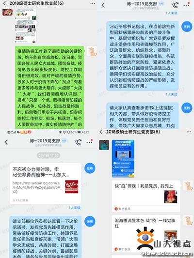 2019级硕士党支部和2019级博士党支部号召全体党员手写承诺书及入党誓词,组织党员开展“学习强国”学习,各个支部广泛宣传防疫知识,发动党员带头做好防控,做好通知传达、信息统计、“停课不停学”以及急于返校学生的思想工作。