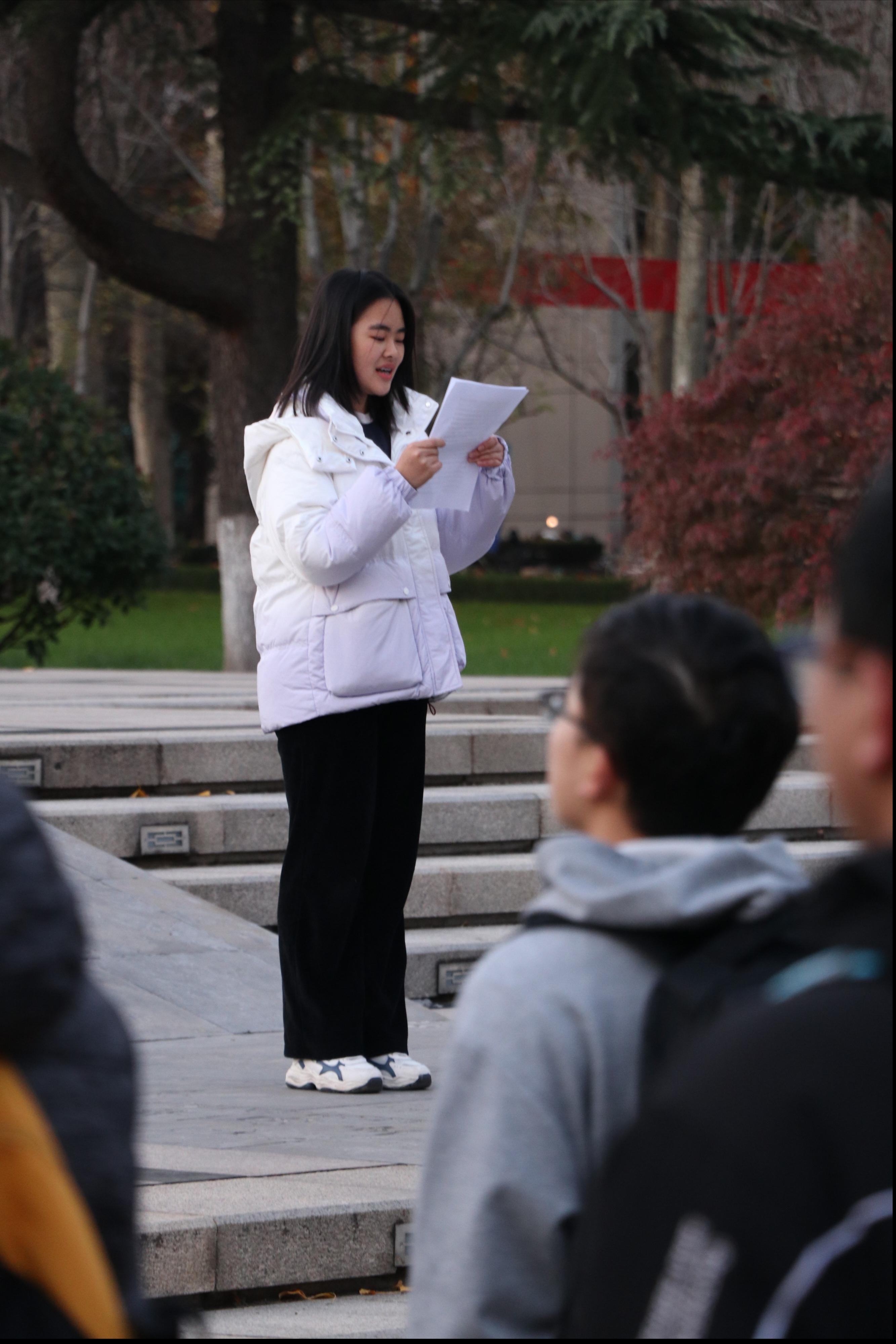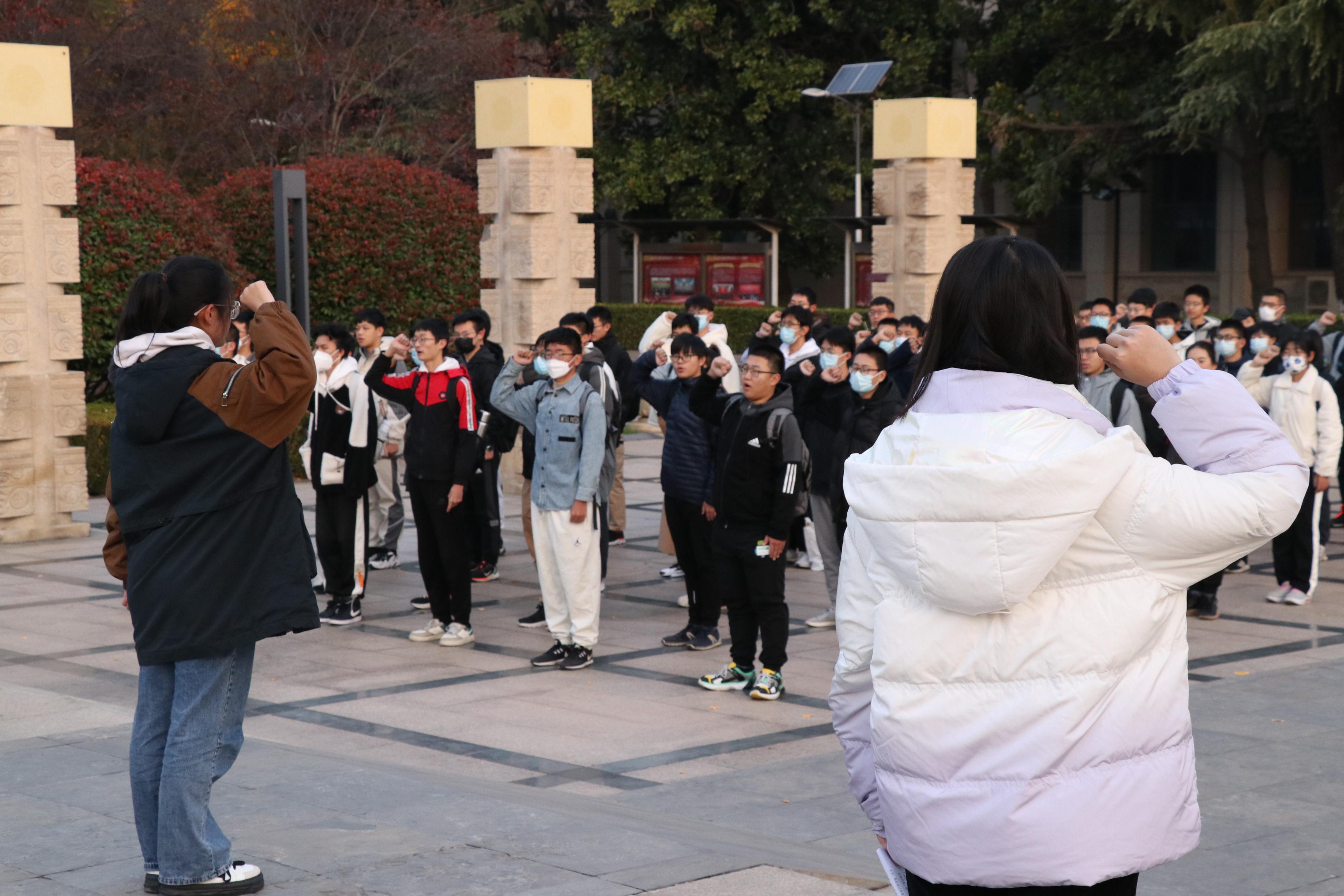 随后,在学院 2022级本科生张金鑫领誓下,全体团员青年列队整齐,高举右拳,重温入团誓词。仪式最后,活动现场团员全场一齐唱响团歌。慷慨激昂的旋律在大成广场上空久久回响,载着全体山大物理人的昂扬志气,尽情彰显团员青年奋发有为的决心!