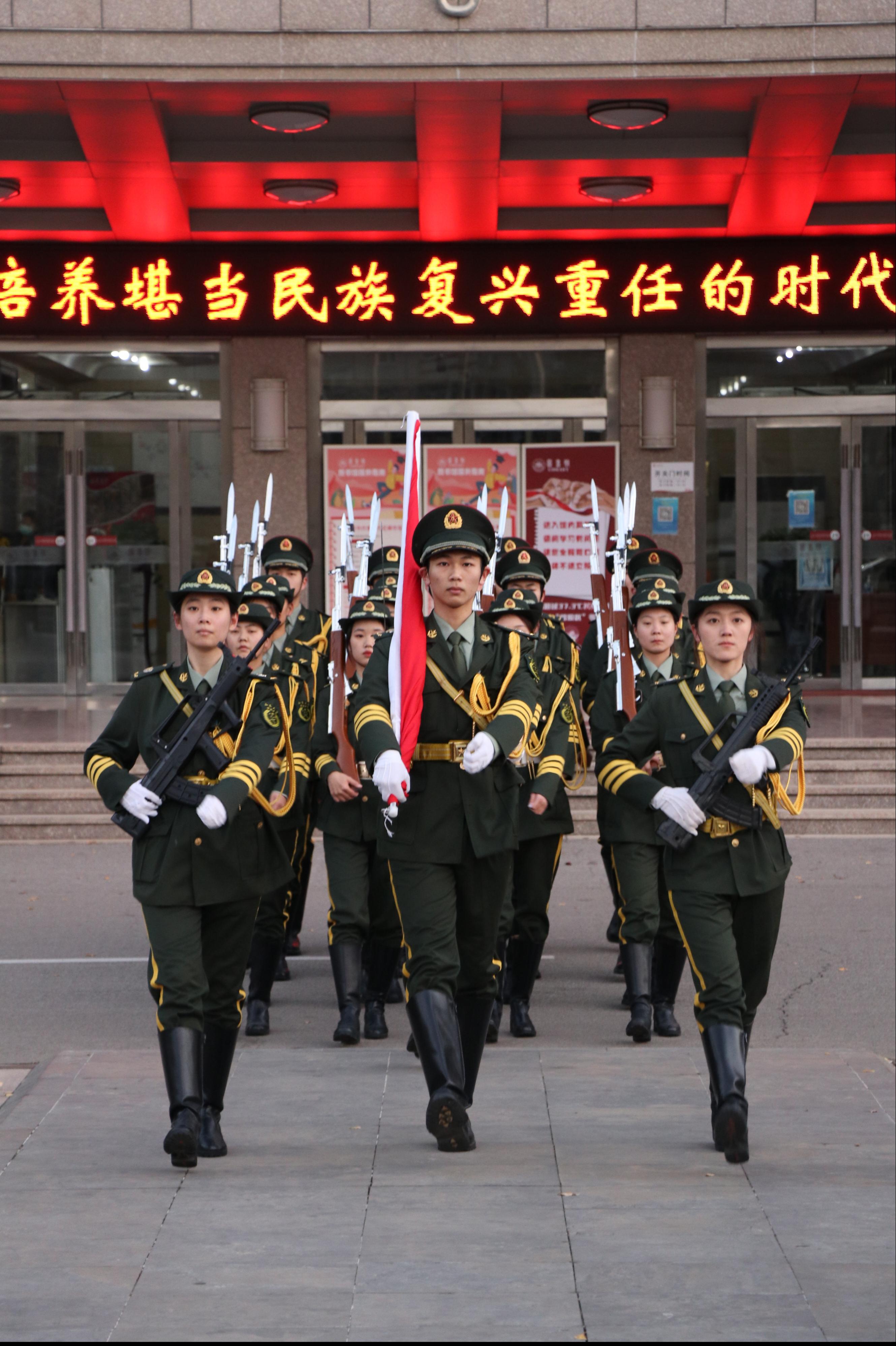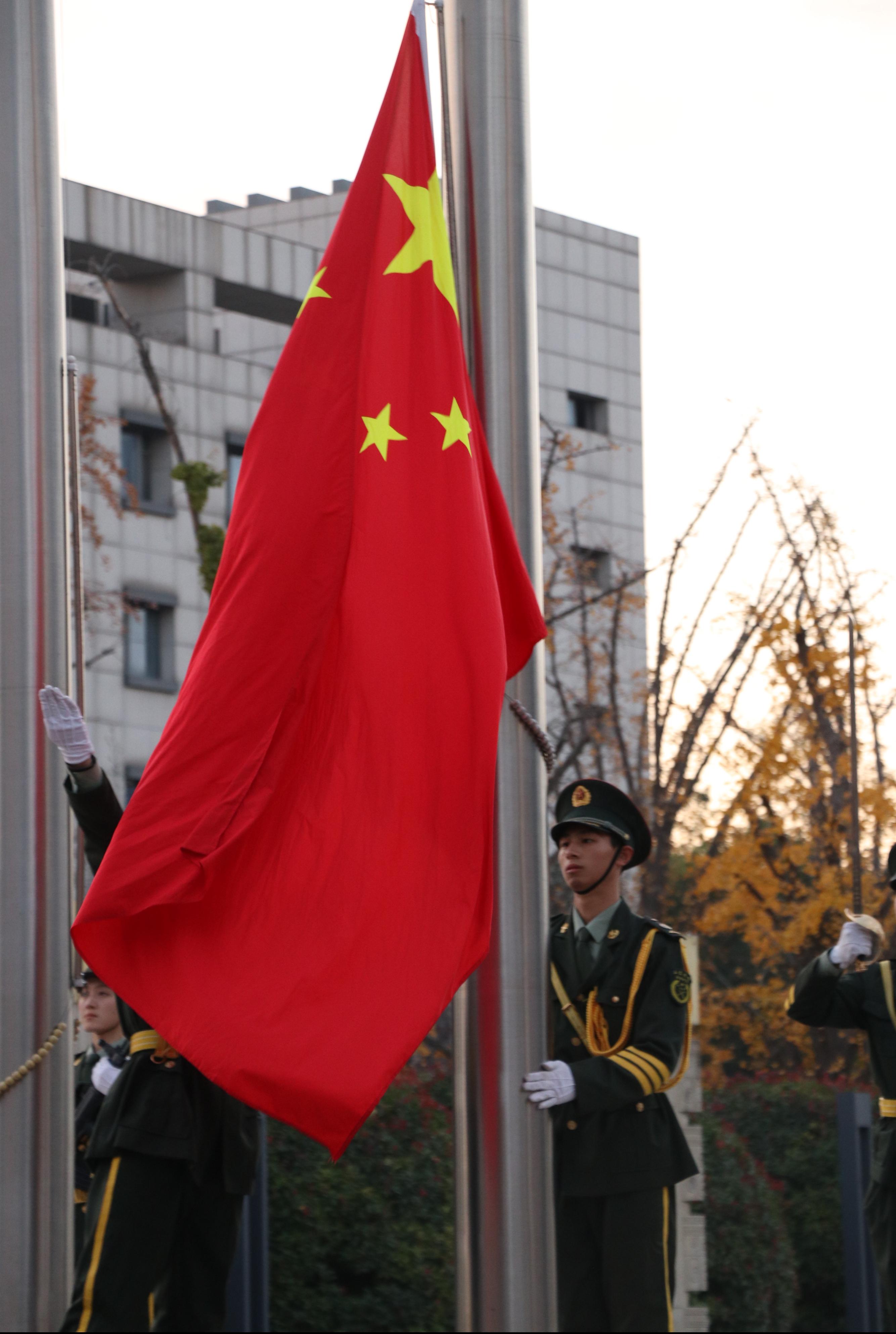 上午6:45,升旗仪式正式开始。学院团员青年庄严肃立,国旗护卫队昂首挺胸,迈着铿锵有力的步伐,高举国旗走向升旗台,在慷慨激昂的国歌声中,全体人员注目国旗冉冉升起,爱国荣校之情涌上心头。