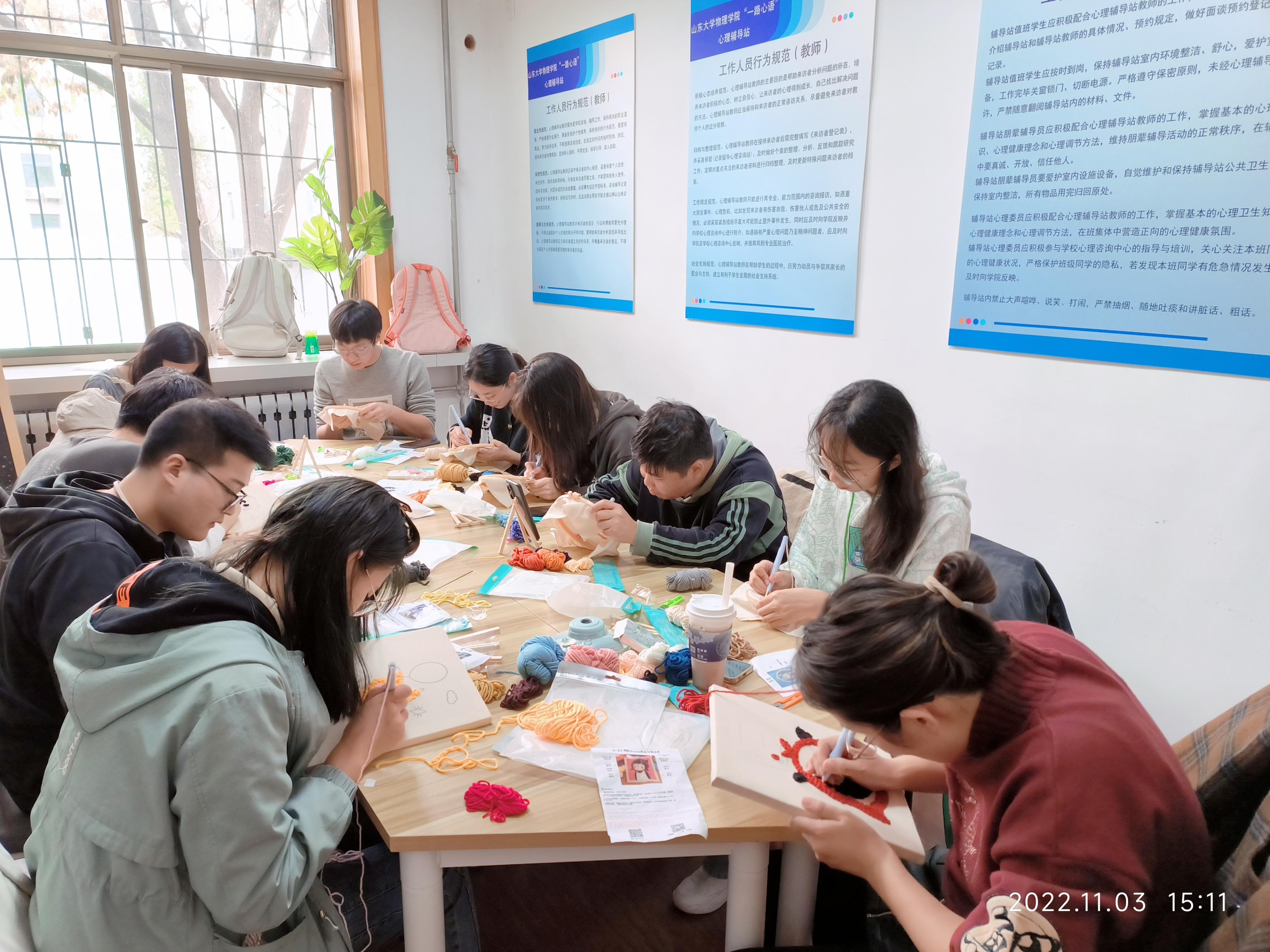 11月3日、11月10日,胜游体育(SYsports)官方网站入口“一路心语”心理辅导站分别举办“向美而行”编织、绘画主题心理沙龙。辅导站教师曹晓习担任沙龙发起人,每期十余位学生参与活动。“向美而行”编织、绘画主题心理沙龙报名对象面向全院学生,尤其在接收报名时优先考虑家庭经济困难、学业困难等同学,旨在通过编织、绘画的方式带领参与同学打开心灵、认识自我,表达情绪、疗愈身心。参与同学无需具备任何编织、绘画技巧,通过手工制作和画笔表达想法...