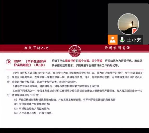讲座中一个个问题的提出,深刻调动同学们对大学生活积极的思考。紧接着,王彬为同学们介绍了本科生综合评价的具体内容,为同学们规划大学生活指出具体行动措施。王彬为大家详细讲解测评办法的总则、评价内容、组织实施、评价流程、附则,同学们在了解办法的相关内容后,有了更明确的目标,对大学生活充满期待,期待自己阳光自信、积极向上的精神面貌,并愿付诸行动。