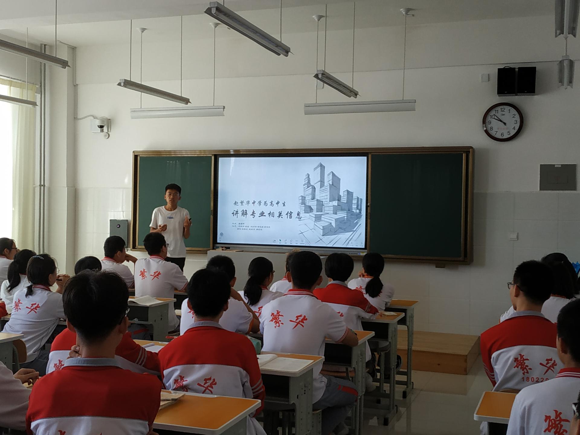 八月十九日我们团队顺利来到了潍坊市繁华中学,并为同学们成功地开展了讲解专业相关信息的介绍。我们为学校的两个重点班的同学们讲解了我们之前早已准备好的内容,同学们对于我们的到来也很开心,因为他们希望对大学及其专业有一个更全面的了解,以及自己将来要面对的专业选择情况。我们为同学们讲解了物理学、国际政治、英语、法语以及能源与动力等几个专业的相关信息,同时解答了同学们的一些疑问,为他们讲述了大学生活的一些趣事,整个宣讲活动十分顺利,同学们在紧张的学习生活中得到了放松,同时了解了一些有用的信息。宣讲之前,我们为学生们发放了一些与专业有关的资料供其参考。宣讲一开始先是由队长进行本次宣讲活动的有关介绍,主要包括本次宣讲活动的背景、内容以及意义等方面,让同学们和老师对此次宣讲活动有一个更为全面的了解。接下来,是由各专业的同学进行各自专业的专门介绍。本次宣讲团队队员涵盖来自外国语、能动、物理等学院,范围较广,能够为高中学生进行更大范围的专业介绍。宣讲的同学们分别介绍了各自专业的主要学习内容、培养方向、专业特色以及现在越来越受到学生和家长关注的就业前景等内容。