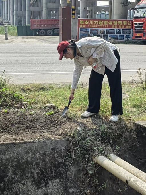 为提高采样工作效率,实践小组按计划分两队开展工作。一队队长徐子皓带领队员郗方伊前往青衣江下游考察,在北外街东门取到水样两升和土样一份,并详细记录下采集时间、地点、温度、海拔高度、经纬度和采集人等重要信息。之后,两人前往距离北外街东门5千米的水津关电站,由于采集点位置偏僻、采集工具简陋,他们不得不攀爬坡道冒险采集水样和土样,最终成功采集到样本。临近正午,两人又前往草坝客运站进行采样工作,短暂的午间休息后,两人冒着高温酷暑,起身前往雅安市一处化工厂遗址采样,观察水质及污染状况,同时记录相关信息。